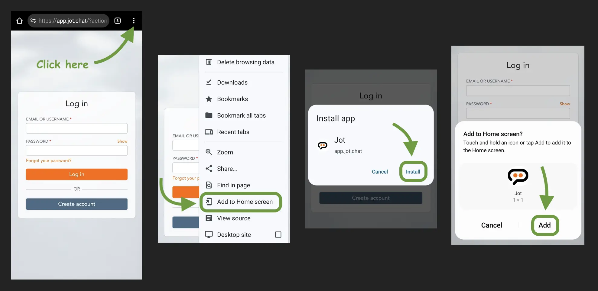 On Android, open your browser and look for a menu icon. On Chrome it's usually at the top, but it might be different for you. Choose "Add to Home Screen" from the menu.