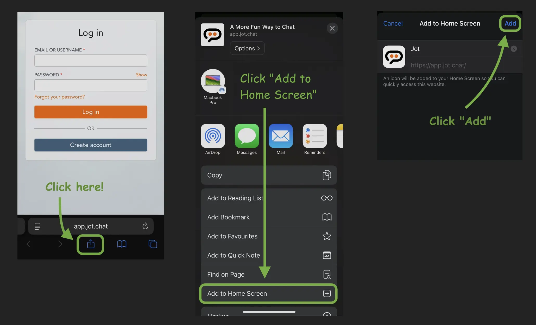 On iPhone, open your browser and look for a menu icon. On Safari it's the icon at the bottom. Choose "Add to home screen" from the menu.